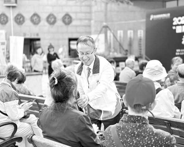 图7:北京市社区处方点评工作组组长陈世财在义诊现场与居民互动。