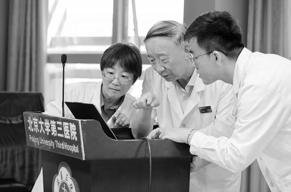 与北京大学第三医院药学部主任药师杨毅恒(左一)进行课件讨论。