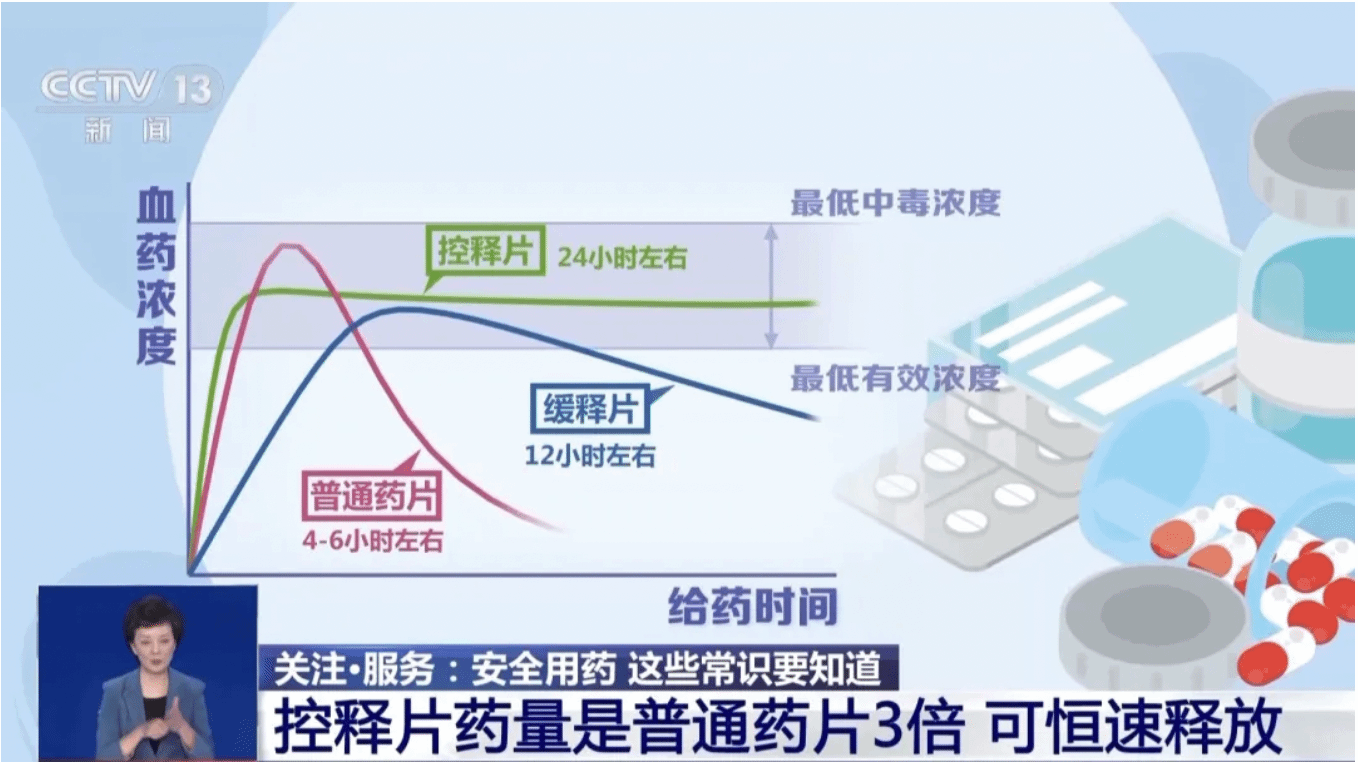 普通药片的药物起效、吸收和消失的速度通常在4—6小时左右,患者24小时内需要服药3次,而控释片可以恒速释放药量,它的药量是普通药片的3倍,患者一天仅需服用一次,药效在体内恒速释放24小时左右。