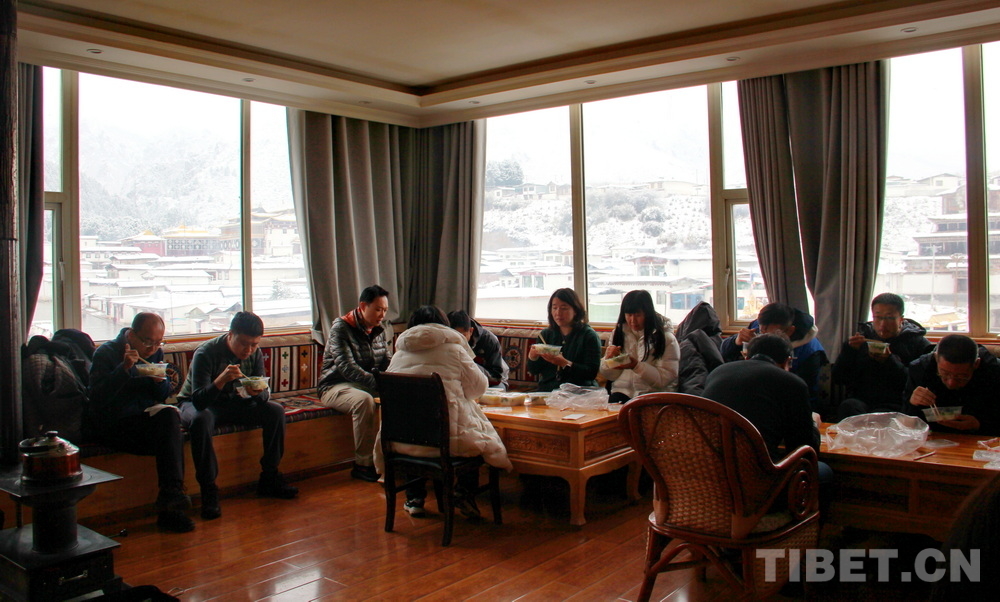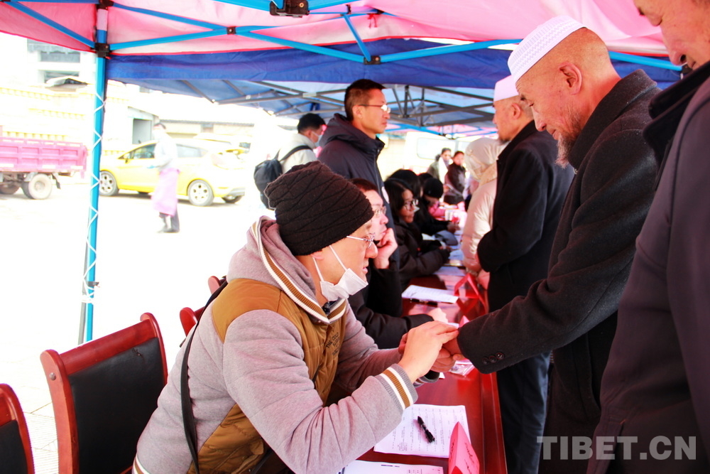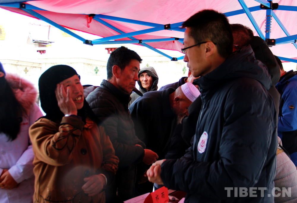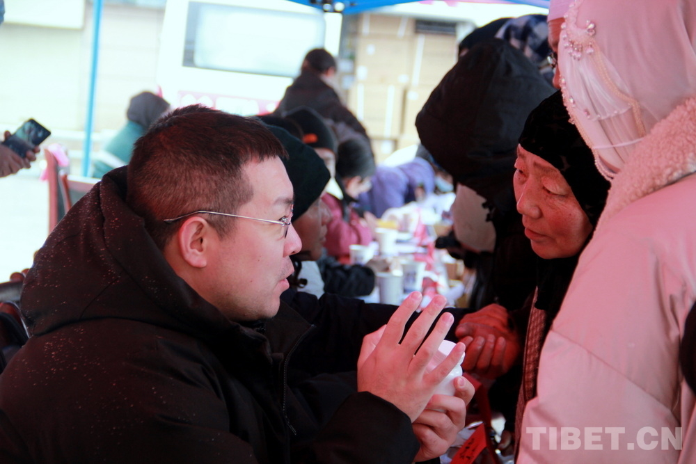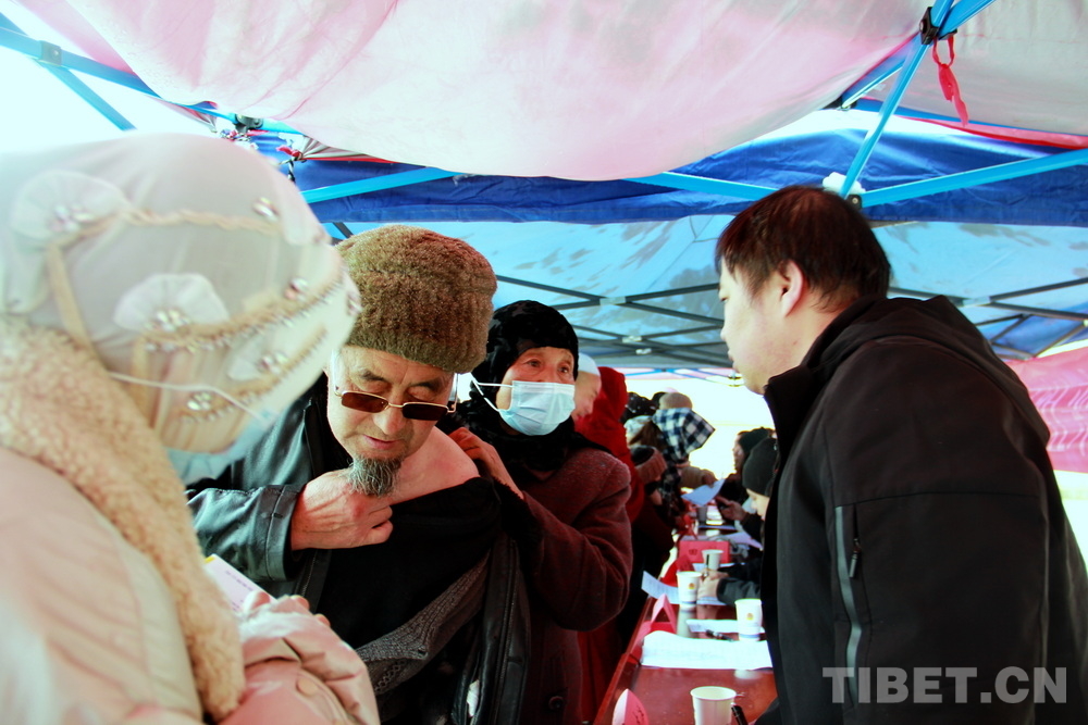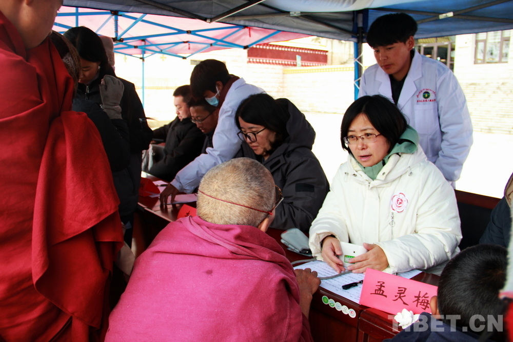在郎木寺义诊点,此前为了容纳更多群众就诊,因此将义诊点设在了寺院门外的小广场。尽管大雪纷飞,但提前得知义诊消息的群众已经陆续赶来,担心临时更换义诊场所影响后续前来的群众就诊,医务志愿者们毫无怨言地在临时搭起的防雨棚下按时开始了义诊。