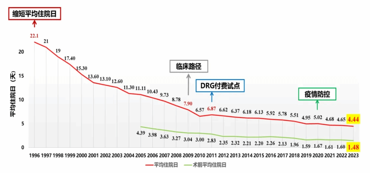 数据显示,北医三院2023年手术例次增长到10.5万台,与之形成鲜明对比的,则是平均住院日的逆势下降,已经从最初的20多天,降至2023年的4.44天,术前住院日在2023年下降到1.48天。