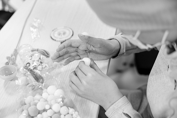 在活动现场的做手工环节中,志愿者朱盼盼(前排右二)手把手教一名患儿做手工。