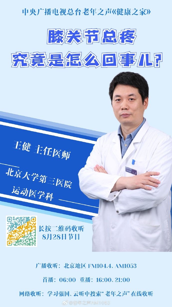 ——【中央广播电视总台】老年之声 8 月 28 日,运动医学科王健医生科普膝关节疼的原因及对策。