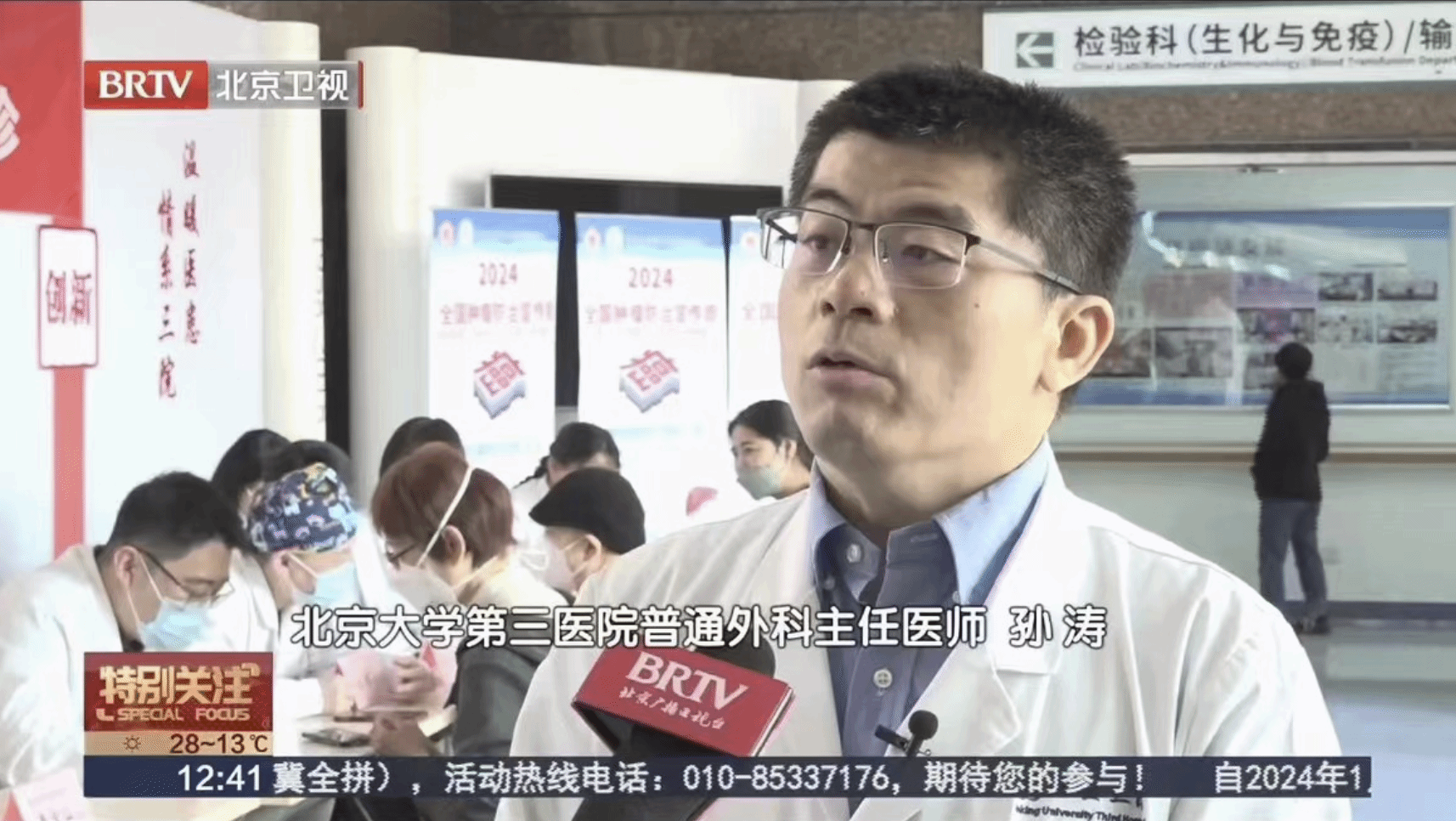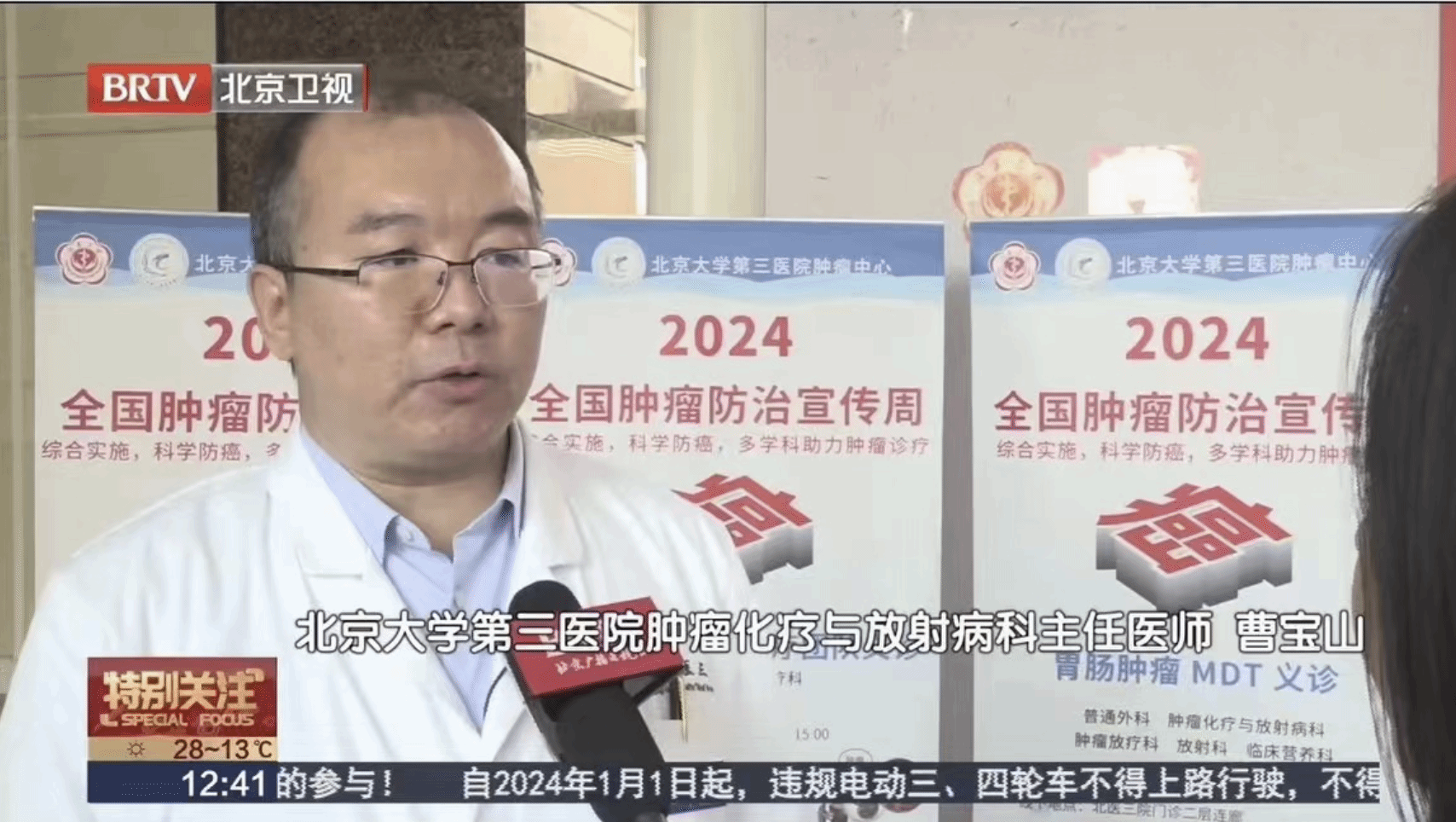 ——【BRTV1】4 月 17 日《特别关注》,普通外科孙涛医生、肿瘤化疗与放射病科曹宝山医生在北医三院多学科综合治疗肿瘤团队开展的义诊活动中接受记者采访。