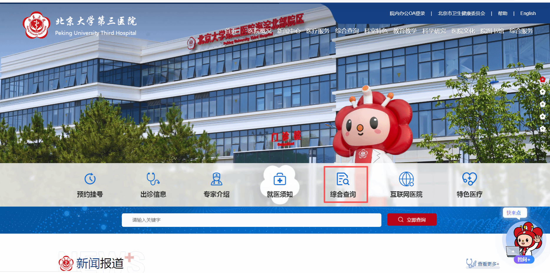 1、登录北医三院门户网站www.puh3.net.cn,点击综合查询按钮(如图)