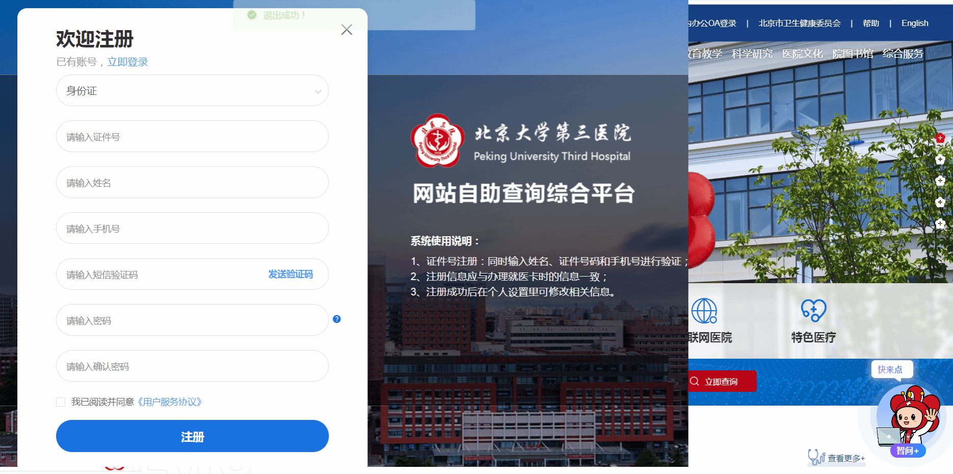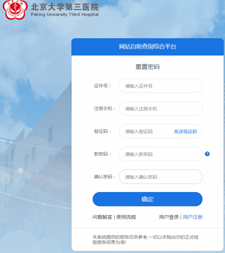 为了改善患者就诊体验,方便检验结果查询,北医三院于2010年7月27日正式启动网上查询检验结果,患者可以登录北医三院门户网站www.puh3.net.cn点击首页左侧检验查询按钮,首次登录的患者需先注册,输入就证件号、姓名、手机号、手机验证码进行验证,然后设定密码提交注册。(注册信息需与办理就医卡时的信息保持一致方可注册成功。)注册成功后即可查阅近期在医院所做过的检验结果报告,并支持检验结果的打印。