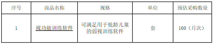 根据工作需要,北京市燕大启明配镜有限责任公司现决定通过议价采购的方式,确定壹 家服务机构,为北京市燕大启明配镜有限责任公司提供:视功能训练软件(可满足用于低龄儿童的弱视训练软件)供应服务。现将有关事项公告如下: