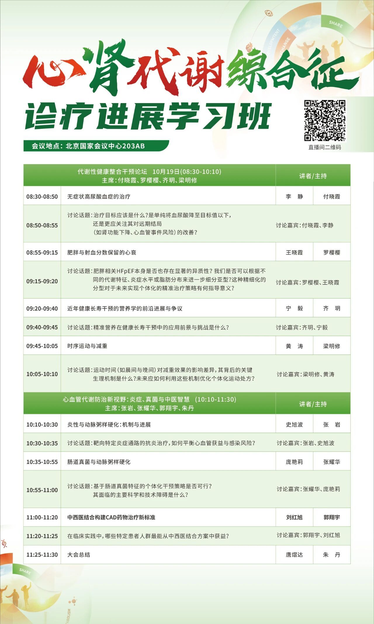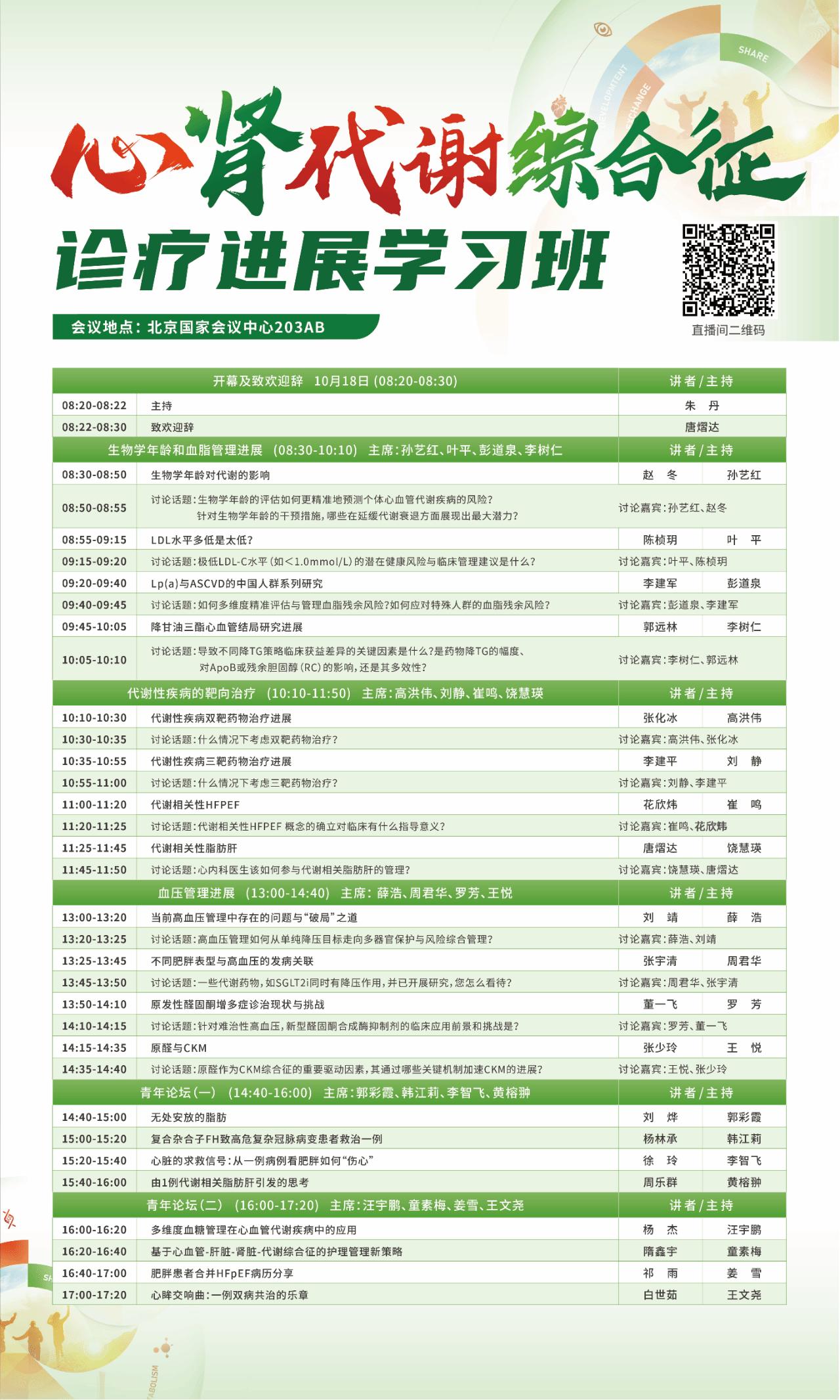 为明确心肾代谢综合征发病机理和潜在治疗靶点,解决防控中的瓶颈问题;更好的实现心血管疾病与肾脏疾病预防、诊断、治疗和康复全链条管理,本次学习班邀请业内知名专家,心血管病及脂代谢、糖代谢异常、肾脏病及中医学科专家,深入交流学科前沿进展,切实推进心肾代谢综合征的诊治和研究在我国发展。我们诚挚邀请心血管、代谢疾病领域的专业人士参加本次学习班,共同交流实践经验,探讨前沿技术,携手共进,为心肾代谢综合征的精准诊断与治疗贡献力量!