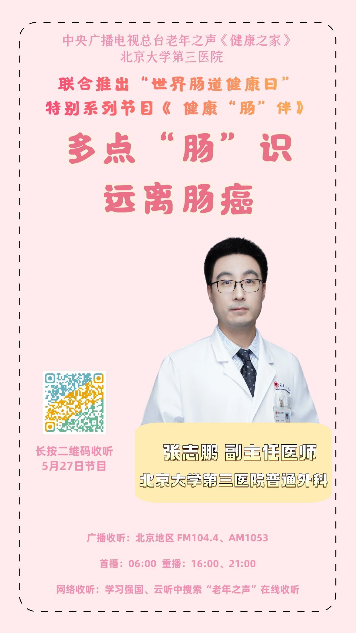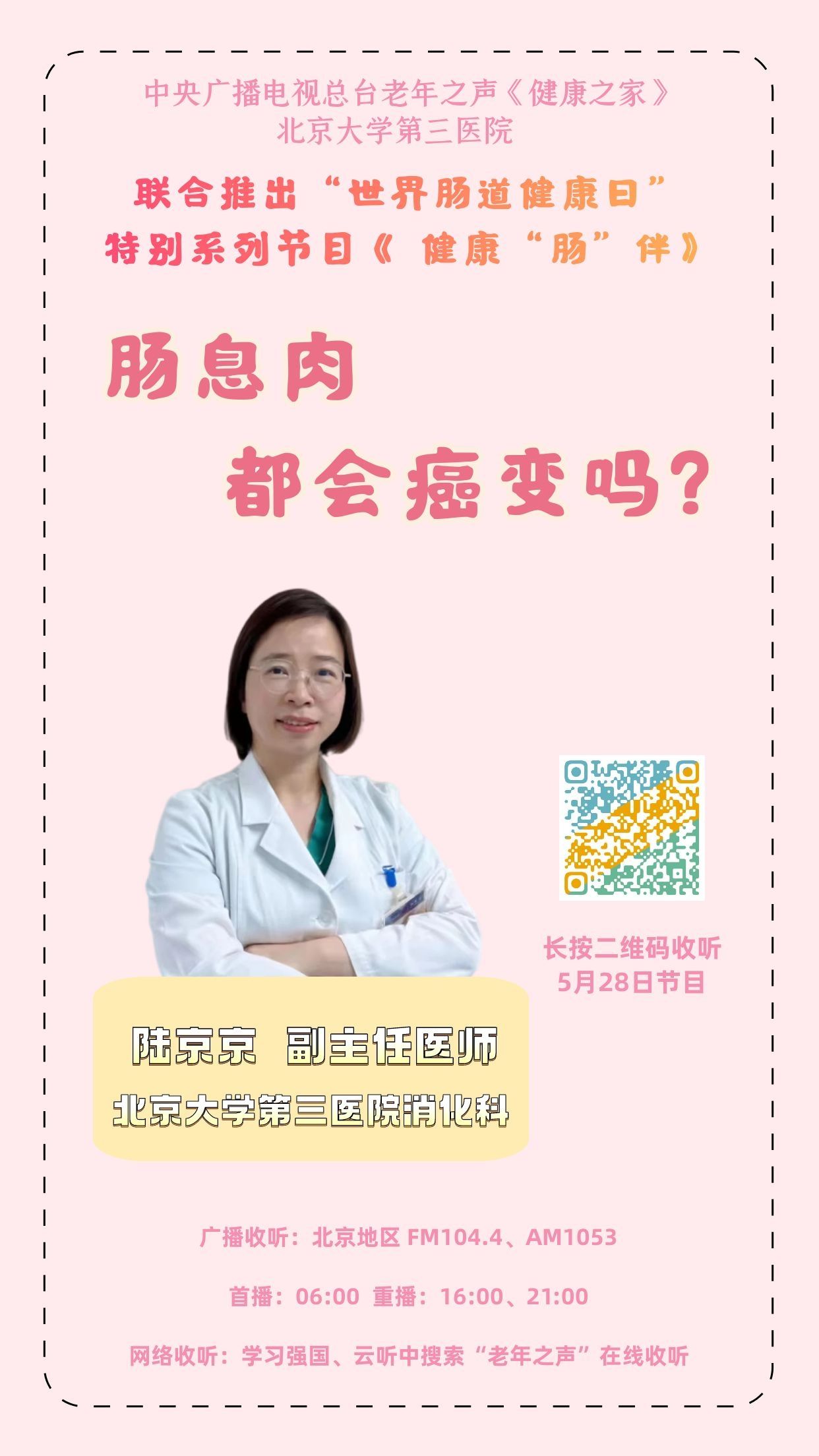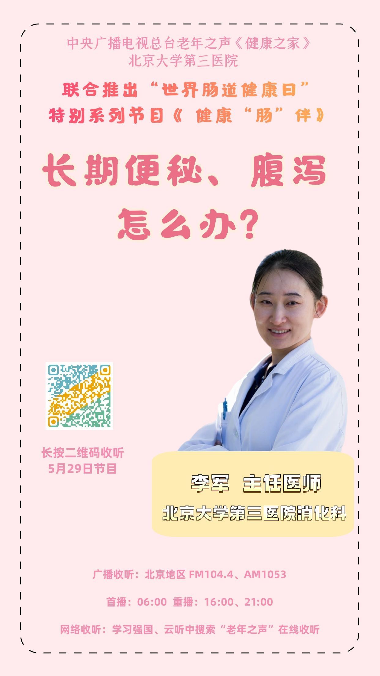 ——【中央广播电视总台】老年之声5月27-29日,世界肠道健康日,我院与中央广播电视总台老年之声合作系列节目,消化科李军、陆京京,普通外科张志鹏医生科普肠道健康相关知识。