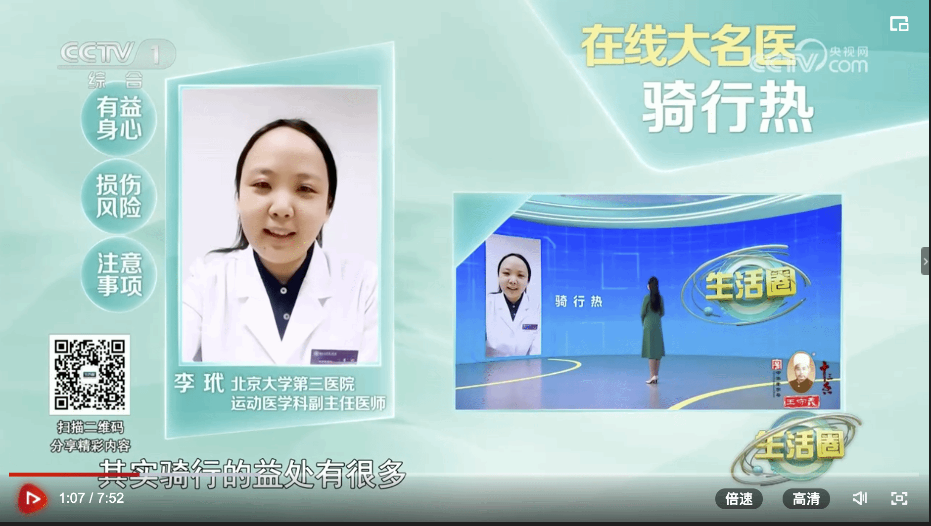 ——【CCTV10】【CCTV1】4月25日《生活圈》栏目,运动医学科李玳医生科普骑行身心的影响。