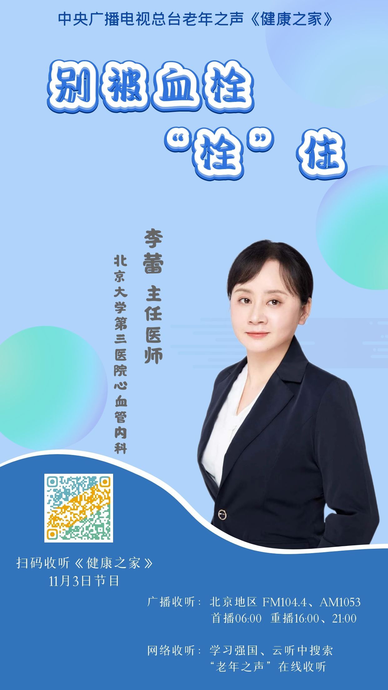 ——【中央广播电视总台】老年之声11月3日,心血管内科李蕾医生科普血栓相关疾病知识。