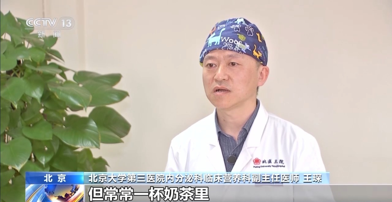 北京大学第三医院内分泌科临床营养科副主任医师 王琛:从中国居民膳食指南来说,一天的添加糖建议不超过50克,最好少于25克,但常常一杯奶茶里就加了超过25克的糖。