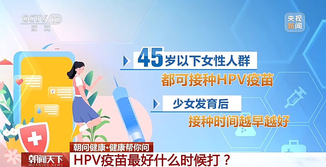 专家表示,45岁以下的女性人群都可以接种HPV疫苗,少女发育后,接种时间越早越好。 北京大学第三医院妇产科主任医师 梁华茂:总体来说,从9—45岁都可以接种HPV疫苗。最好在9—16岁没有开始性生活之前接种疫苗,能够获得最大的免疫效果。
