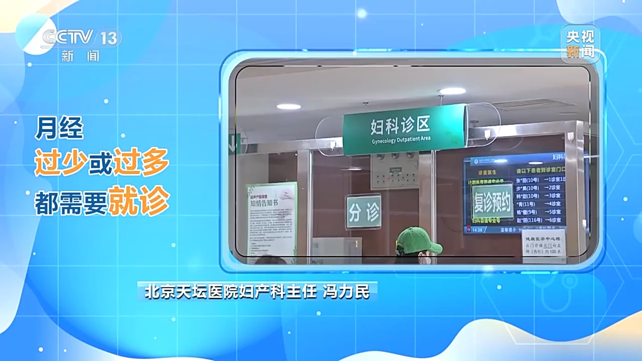 北京天坛医院妇产科主任 冯力民:不来月经可能意味着卵巢功能的早期衰竭,还有一些其他疾病的发生;月经多会造成贫血状态,会造成心肺功能,尤其是脑功能的降低。月经过少或过多都需要就诊。