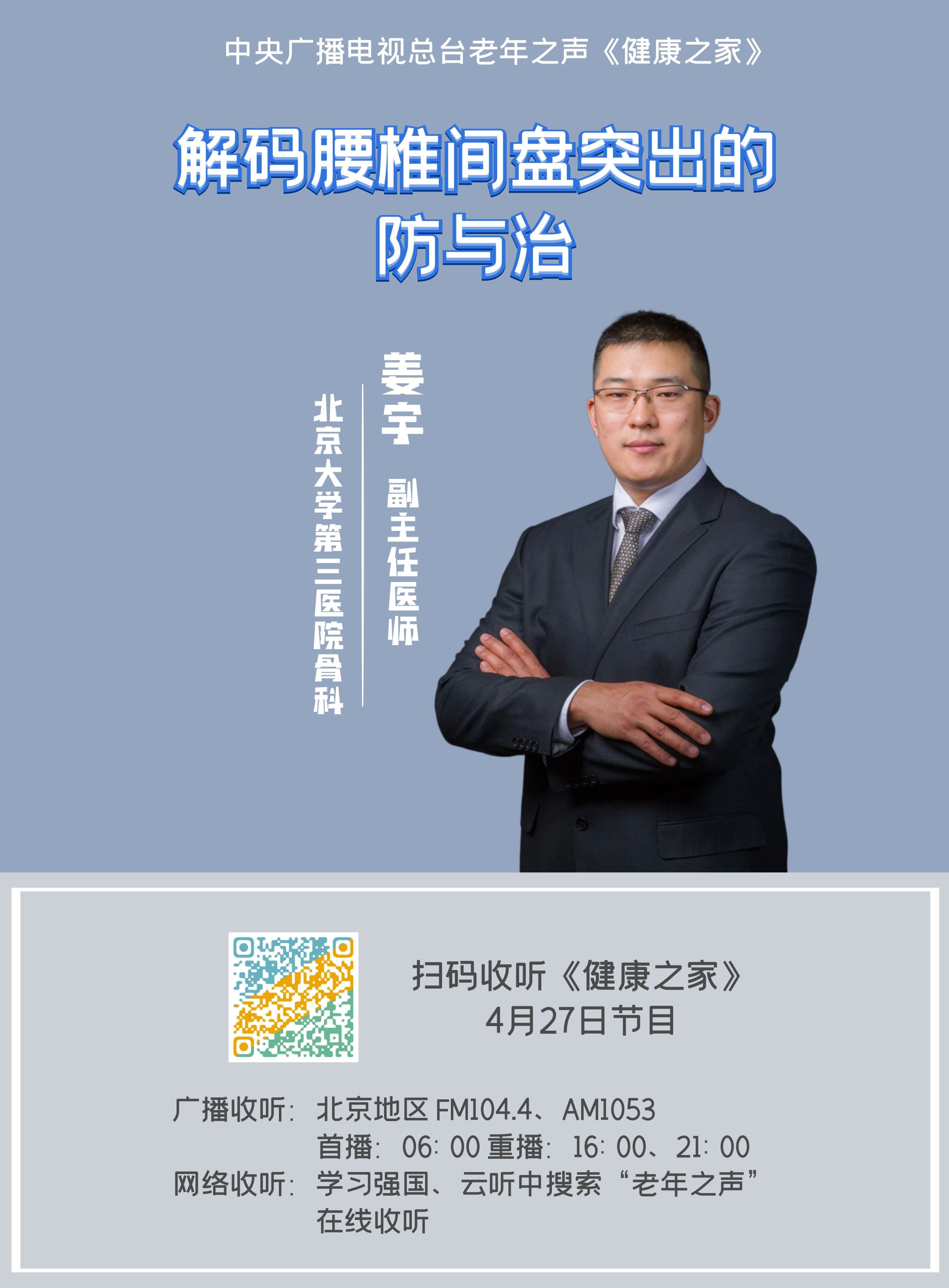 ——【中央广播电视总台】老年之声4月27日,骨科姜宇医生科普腰椎疾病知识。
