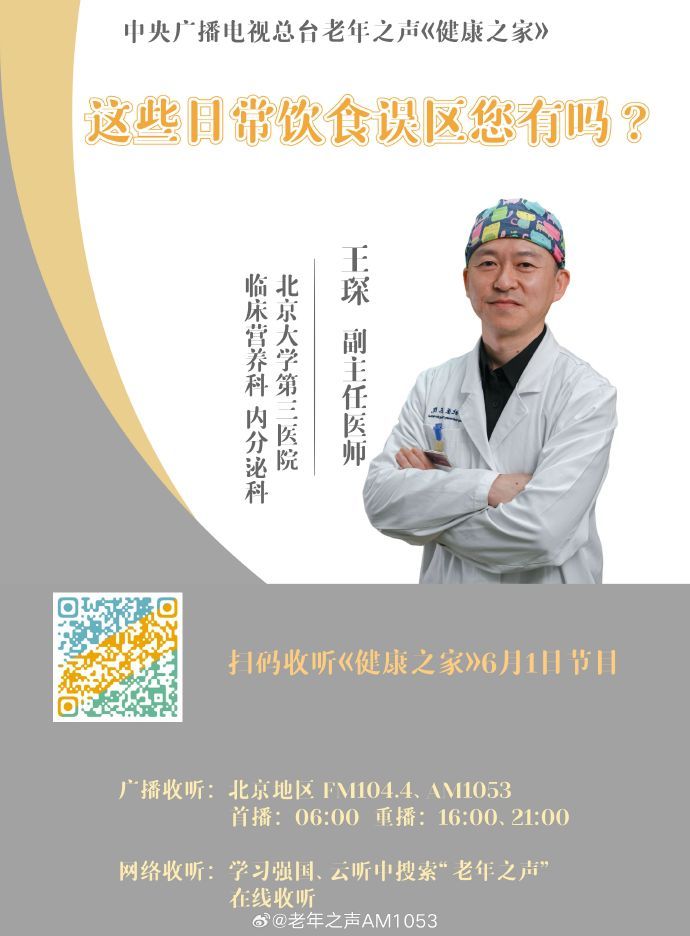 ——【中央广播电视总台】老年之声 6 月 1 日,内分泌科、临床营养科王琛医生科普饮食误区。
