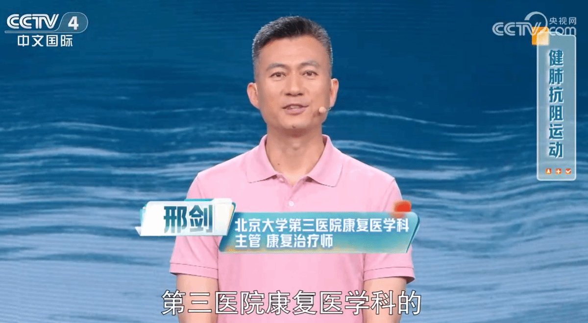 ——【CCTV4】8 月10 日《健康中国》,康复医学科邢剑康复师演示健肺抗阻运动。