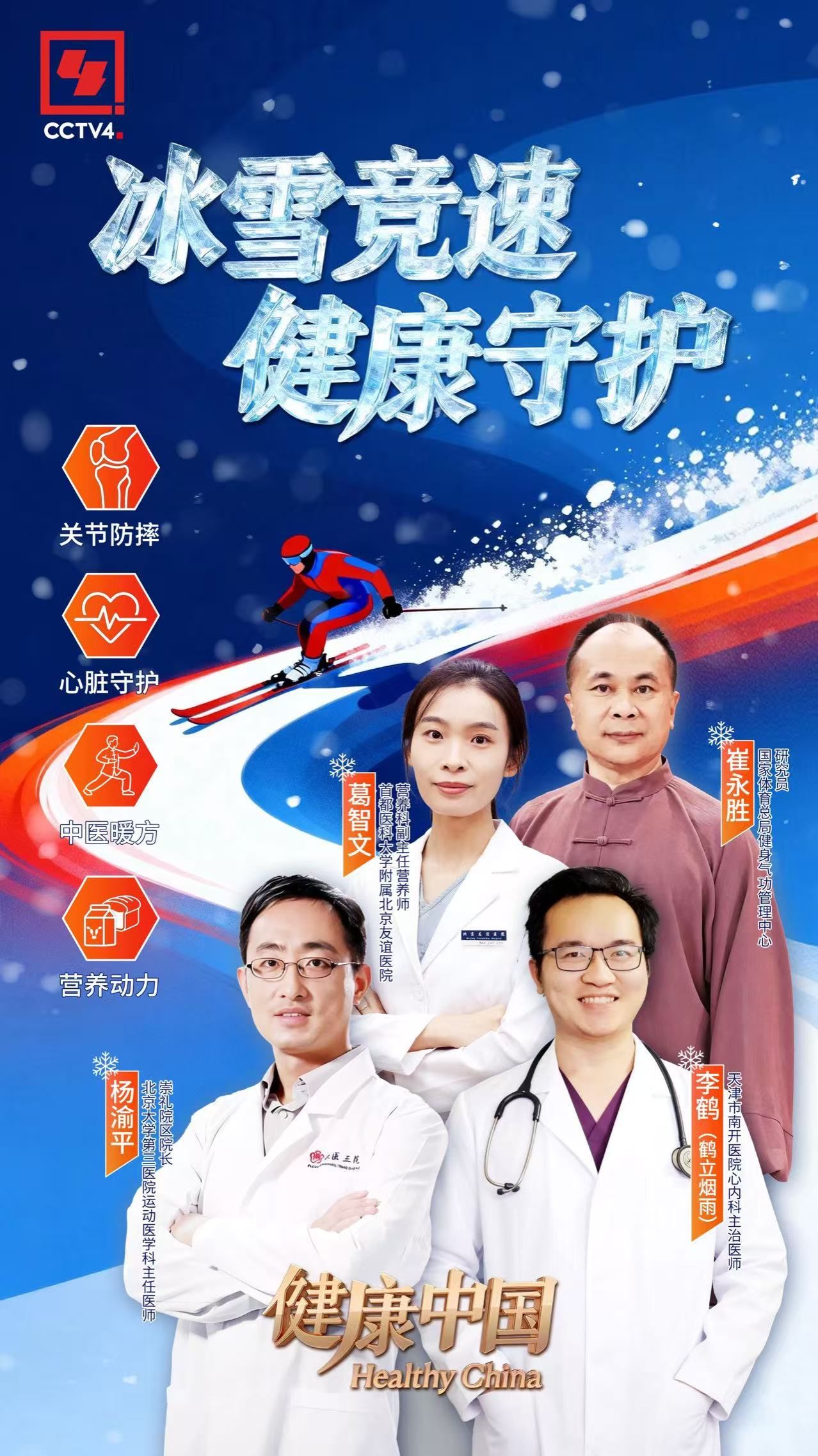 CCTV4《健康中国》栏目特邀骨科、心内科、营养科、中医四大领域权威专家,推出冬奥系列健康攻略——“冰雪竞速,健康守护”。让你不仅看热闹,更懂门道!不论你是冰雪运动爱好者,还是想跟着奥运热潮动起来,这篇干货都能让你安全“解锁”冬季运动!