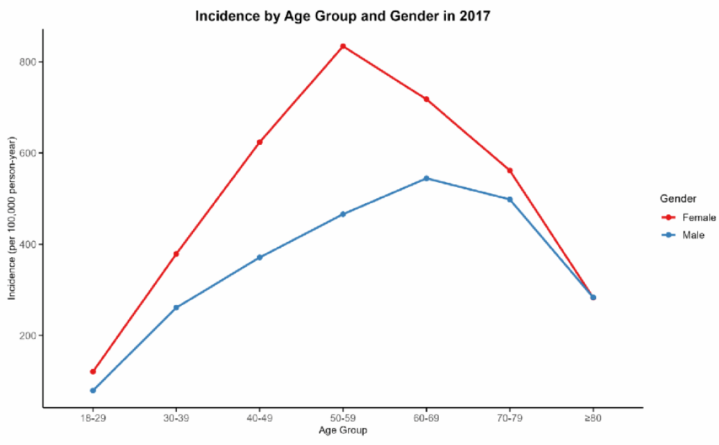 2017年中国城镇地区颈椎病年龄相关发病率。图片来自《柳叶刀》官网截图。