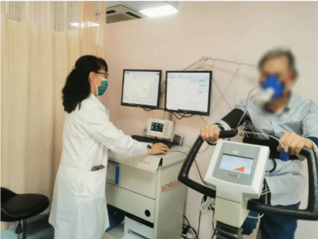 根据患者的一些风险因素情况和不适症状,我们会建议进行运动耐力测试。这项检查可以在运动状态下,持续监测一个人的摄氧量、二氧化碳排出量、心率、血压以及心电图变化,一方面判断冠心病风险和猝死风险,同时还能评估心肺耐力。