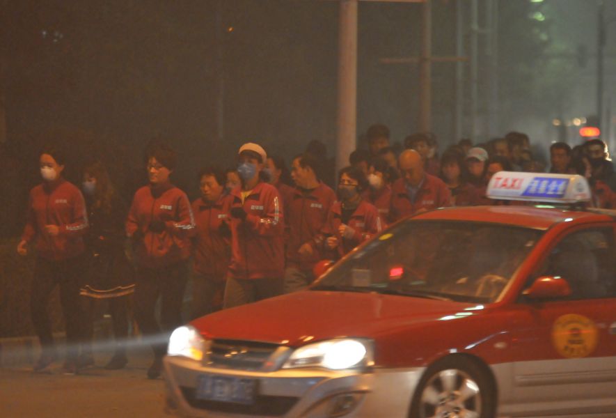 2015年11月09日,辽宁省沈阳市,夜间雾霾严重持续未散,百人“暴走团”戴口罩现身街头。北方供暖开始约一周后。辽宁省11个城市空气质量达到重度污染以上。8日,沈阳全市PM2.5均值一度达到1155微克/立方米,局地突破1400微克/立方米,城区被灰白色的霾笼罩,能见度不足百米。在这种来势汹汹的十面“霾”伏中,还要出门暴走健身吗?