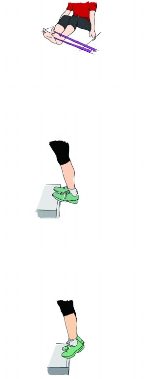 患侧脚掌踩在台阶上,足跟及足弓在台阶以外,从充分勾脚体位用力提踵直到充分绷脚体位,动作标准、数量同方法1、2,要求尽量在最大行程内完成动作,如果力量有限,可在上肢协助下完成。