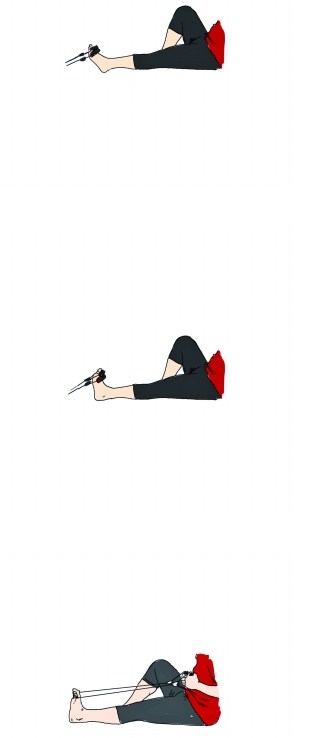 坐在床上,膝关节屈曲,双腿、膝关节、足跟并拢,脚面稍绷直,用皮筋套住两脚,患脚用力外翻,动作标准、数量同上。