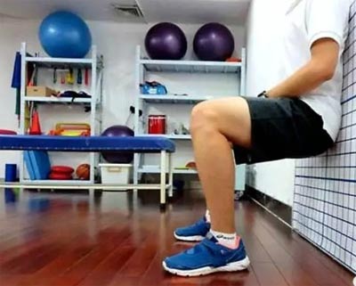 具体练习方法是:背靠墙,双足分开,与肩同宽,逐渐向前伸,和身体重心之间形成一定距离,大概40~50公分。此时身体就同时已经呈现出下蹲的姿势,使小腿长轴与地面垂直。大腿和小腿之间的夹角不要小于90度。一般每次蹲到无法坚持为一次结束,休息1~2分钟,然后重复进行。每天重复3~6次为最好。