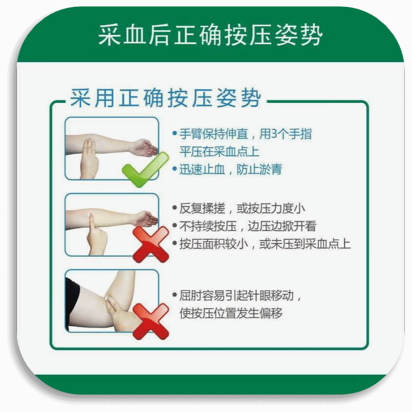 现在我们了解了静脉采血后正确的按压方法,为了减少采血后皮下淤血的发生,让我们一起正确按压。