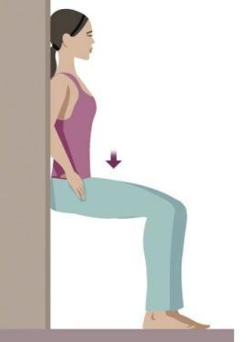 3.靠墙静蹲练习:背靠平整墙面站立,头、肩、背、臀贴墙,双脚与肩同宽,向前迈出约 30 - 40 厘米;缓慢下蹲 40°-90°,小腿与地面呈 90 度,双手可放两侧或前伸保持平衡;保持静止,均匀呼吸,初学者每次 30 - 60秒,做 3 - 4 组,后续再逐步增加时长和组数,过程中若感不适立即停止;
