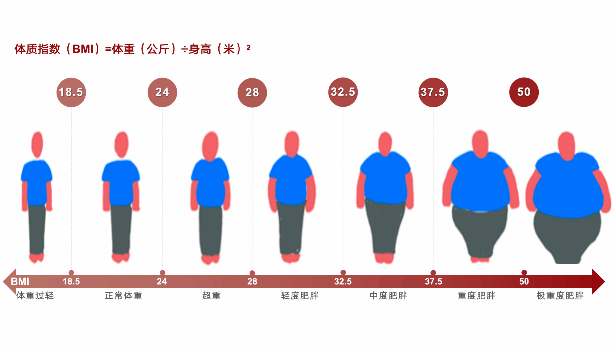 1. 体质指数(BMI):这是衡量人体胖瘦程度的常用标准,计算方式为体重(kg)除以身高的平方(m²)。依据现行《成年人体重判定》行业标准,我国成年人体质指数应维持在18.5≤BMI<24.0 。BMI<18.5为体重过轻,可能导致免疫力下降、贫血等;24.0≤BMI<28.0为超重,BMI≥28.0为肥胖,超重和肥胖可是糖尿病、高血压等心脑血管疾病以及部分癌症的重要危险因素。