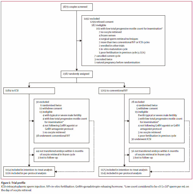 本研究共招募并纳入2329对不孕夫妇,均为第1或2次接受体外受精治疗周期的非严重男性不育患者,排除了接受供精或捐卵者、前次体外受精治疗周期中受精率低(≤25%)的患者、接受植入前遗传学诊断的患者以及其它禁忌症患者,采用按中心分层、区组随机化的方法,在知情同意的原则下,将研究对象随机分配到常规IVF治疗组(1154对夫妇)和ICSI治疗组(1175对夫妇)。主要结局指标是第一次移植后的活产率,次要结局指标包括:受精率、受精失败率、移植率、流产率、早产率、低出生体重率等,并持续随访了两组人群的累积活产率等结局情况。