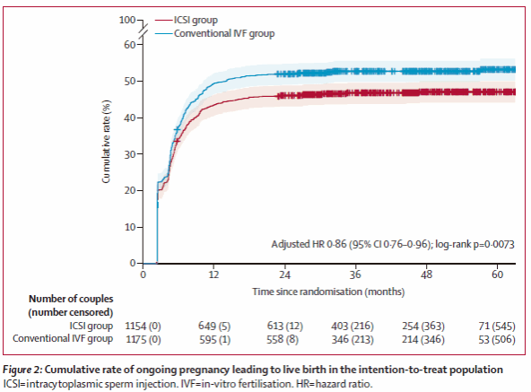 研究结果证实:在非严重男性因素不育患者中,与常规IVF技术相比,ICSI技术不能提高第一次移植后的活产率,获得的可利用胚胎数较少、移植率较低,而且后续观察到的累积活产率也相对较低。