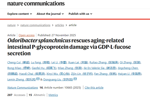 2025年11月27日,北京大学第三医院药物临床试验机构刘东阳研究员团队和北京大学基础医学院郑乐民教授团队合作,在Nature Communications(《自然—通讯》)上发表题为“Odoribacter splanchnicus rescues aging-related intestinal P-glycoprotein damage via GDP-L-fucose secretion”( 内脏臭气杆菌分泌GDP-L-岩藻糖修复衰老肠道P-糖蛋白损伤)的研究论文。