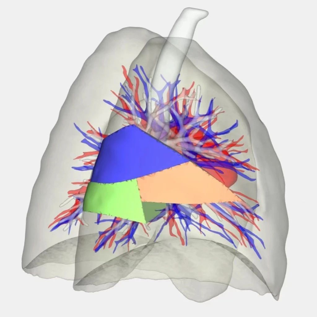 手术前,我和团队使用三维重建技术构建陈先生肺部的图像,更直观地呈现出肺部血管和支气管的解剖结构,展示结节和周围组织的毗邻关系,有助于确定具体的手术切除范围。