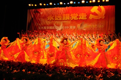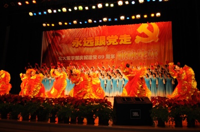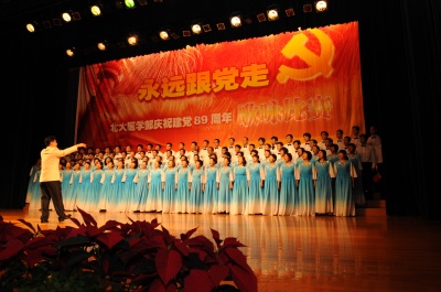 在“永远跟党走—北京大学医学部庆祝建党89周年歌咏比赛”中,我院有124职工代表医院参加了合唱比赛。一曲《飞翔吧,中国》以其强大的表演阵容、朝气蓬勃的精神风貌、嘹亮的歌声和高超的演唱水平博得了全场领导和观众的阵阵掌声,精美的艺术设计和精彩的表演形式,舞蹈的感染力全方位的彰显了北医三院人团结一心,以医院为荣的向心力和凝聚力。感动了在场评委和观众,最终以96.32分的成绩名列医学部系统13家参赛单位之首,党委贺蓓书记、院长助理阎高毅参加演出,李树强副书记特邀担任评委。