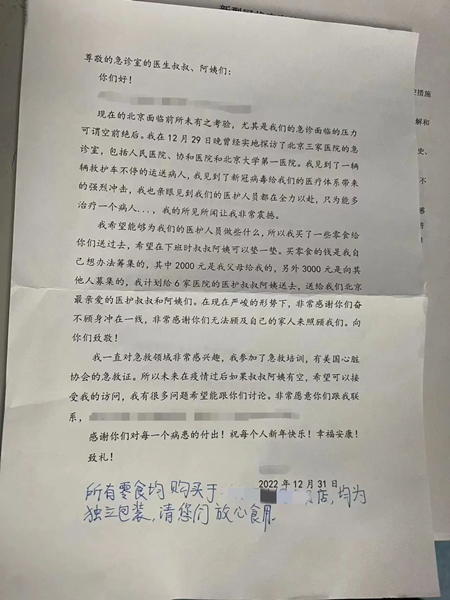 “喂,葛老师,有个人大附中的学生给咱们送来好多吃的,实在推不掉,怎么办?”“有父母在吗?是有什么亲属在咱们科救治吗?”“都不是,就是单纯觉得医务人员太辛苦,自筹经费来慰问咱们。”