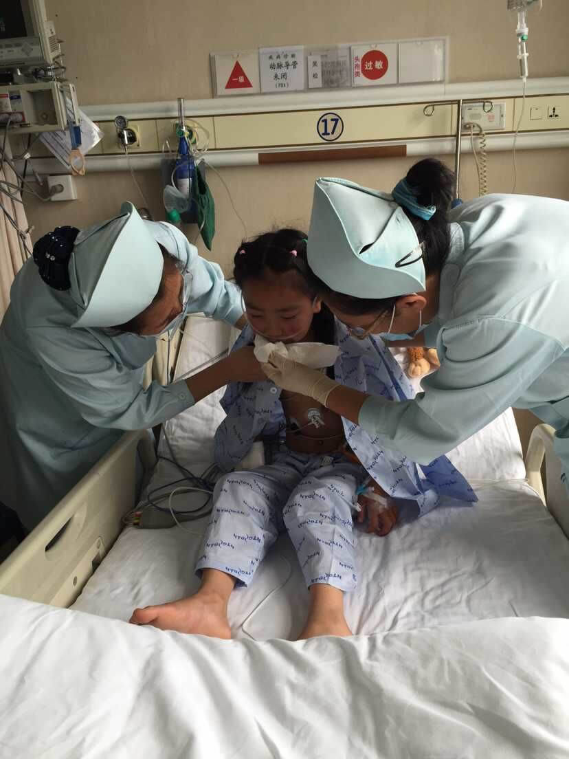 16日一早,心脏中心万峰教授、张喆主任医师两位专家分别主刀,吴松、付元豪两位大夫为助手,为吴常荣、李嘉、高梓桐3名藏区小患者进行了经胸伞堵手术和体外循环下房缺修补术,手术进展顺利。9月21日,又为杨玥、宽忠华么和宋永婷施行了心脏手术,虽然患者们病情复杂,由于术前准备工作充足,手术均进展顺利。术后,小患者们被送进心脏中心监护室,护理部主任李葆华亲自到监控室了解、查看患者术后情况。