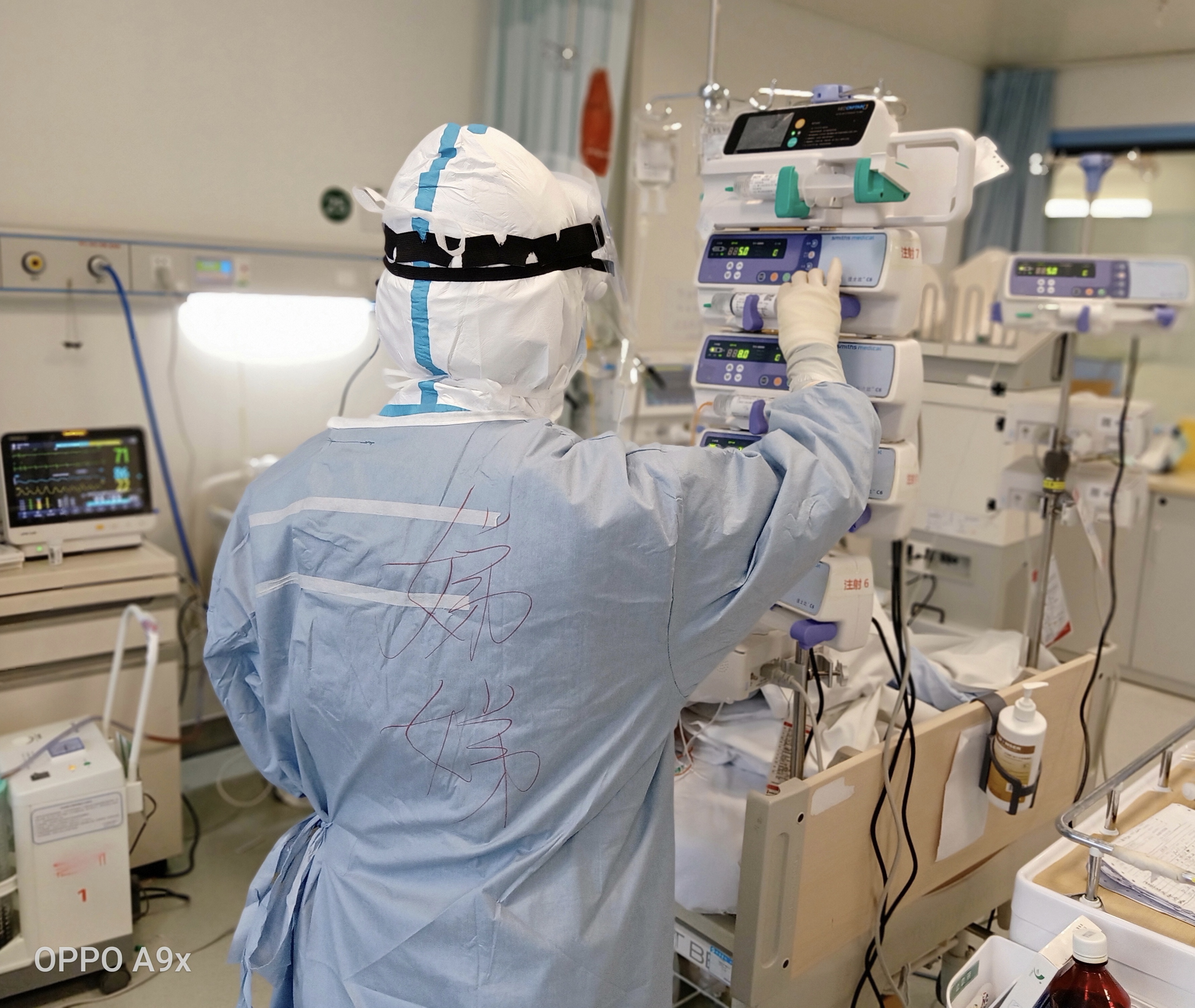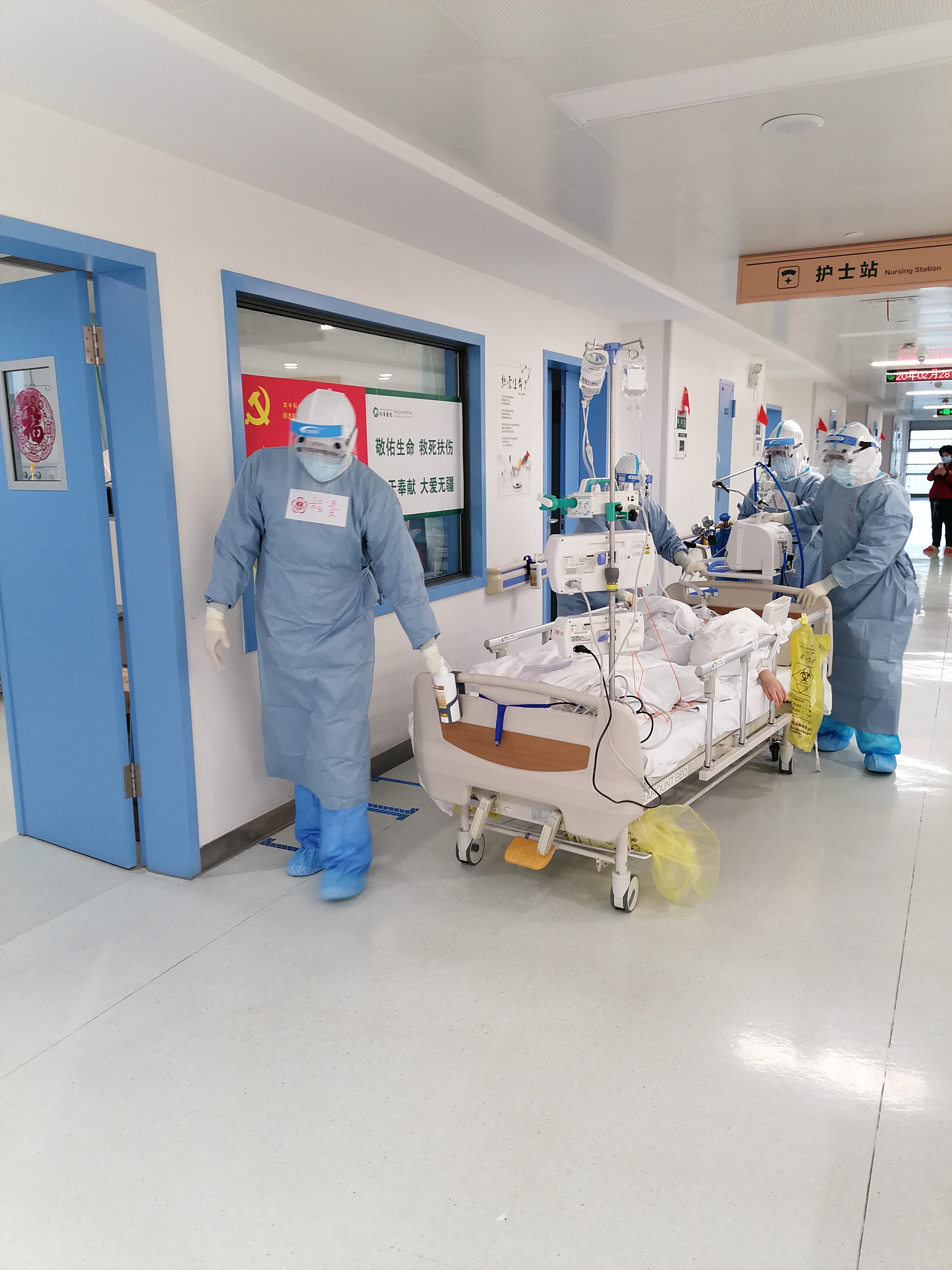 《转运为了方便重症病人统一管理,医护人员带着呼吸机、氧气桶顺利完成了病房内的转运》