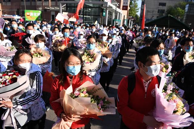 下午4时许,北医三院大门口,欢迎的队伍翘首而望。这里,有所有的院领导,有科室主任、有队员们的同事和家人。载有队员的车队一到,现场立即暴发出热烈的掌声和欢呼声。大家挥动手中的院旗和鲜花,向这些最美的逆行者们献上崇高敬意。