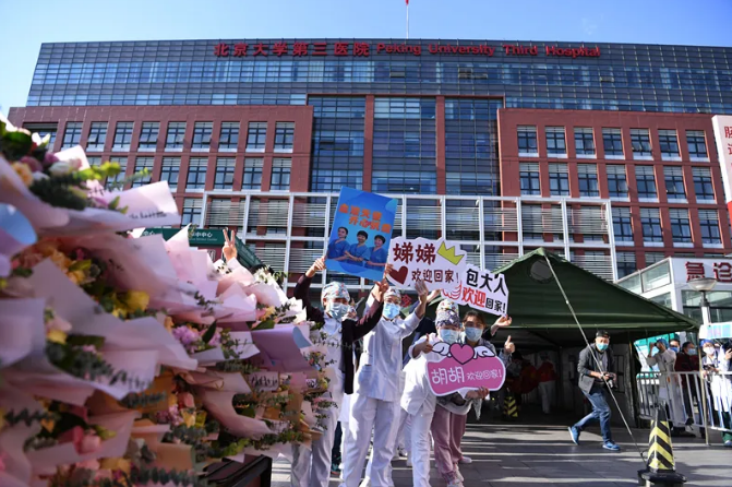 下午4时许,北医三院大门口,欢迎的队伍翘首而望。这里,有所有的院领导,有科室主任、有队员们的同事和家人。载有队员的车队一到,现场立即暴发出热烈的掌声和欢呼声。大家挥动手中的院旗和鲜花,向这些最美的逆行者们献上崇高敬意。