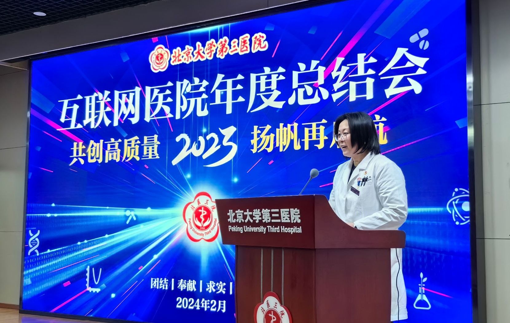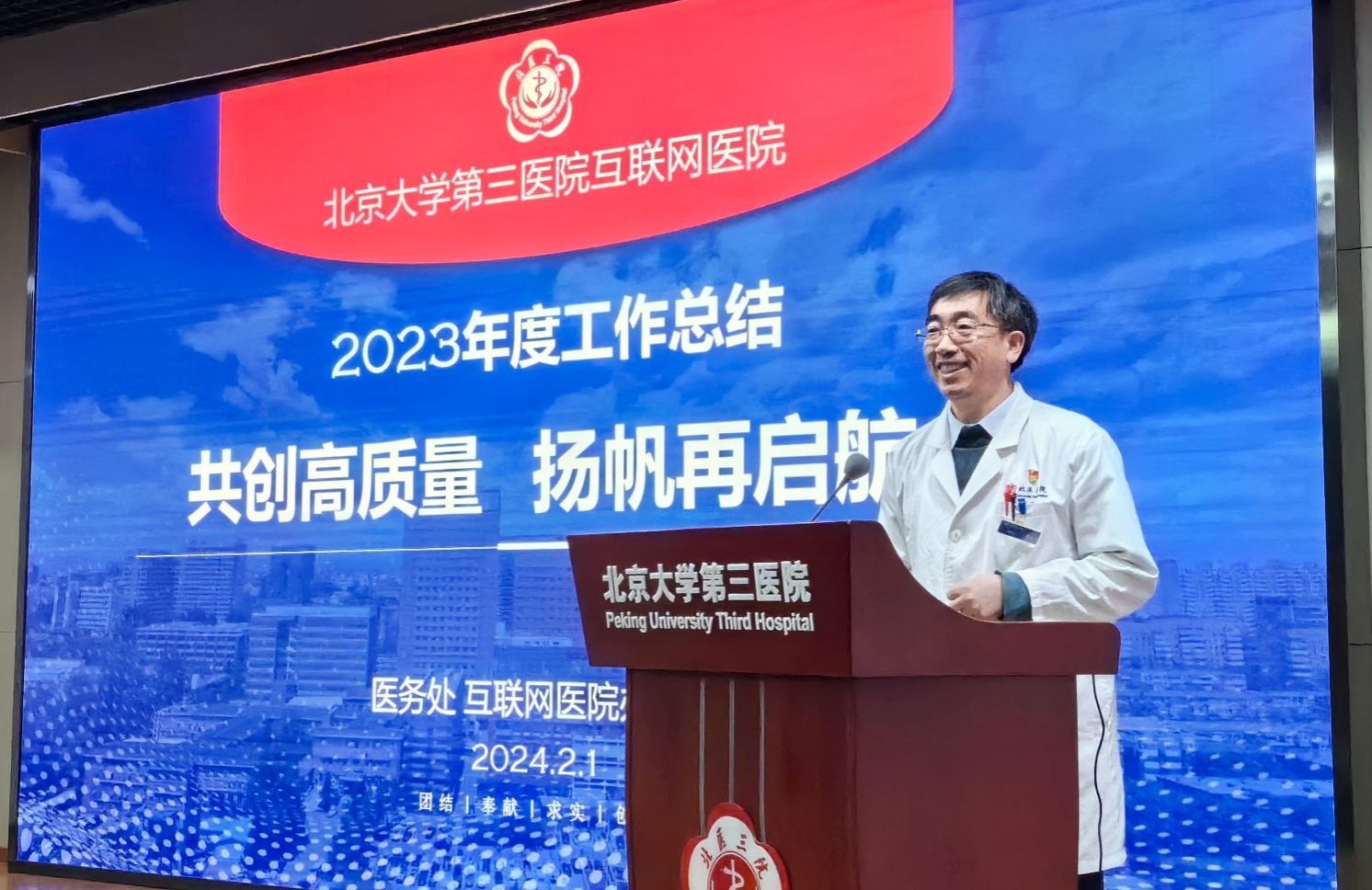 2024年2月1日,北医三院互联网医院召开了2023年度总结会。付卫院长、沈宁副院长、宋纯理副院长、李蓉副院长,医务处处长、互联网医院办公室主任胥雪冬,信息管理与大数据中心主任计虹及部分临床医技科室、职能处室负责人、互联网医疗专员参加,会议由李蓉副院长主持。