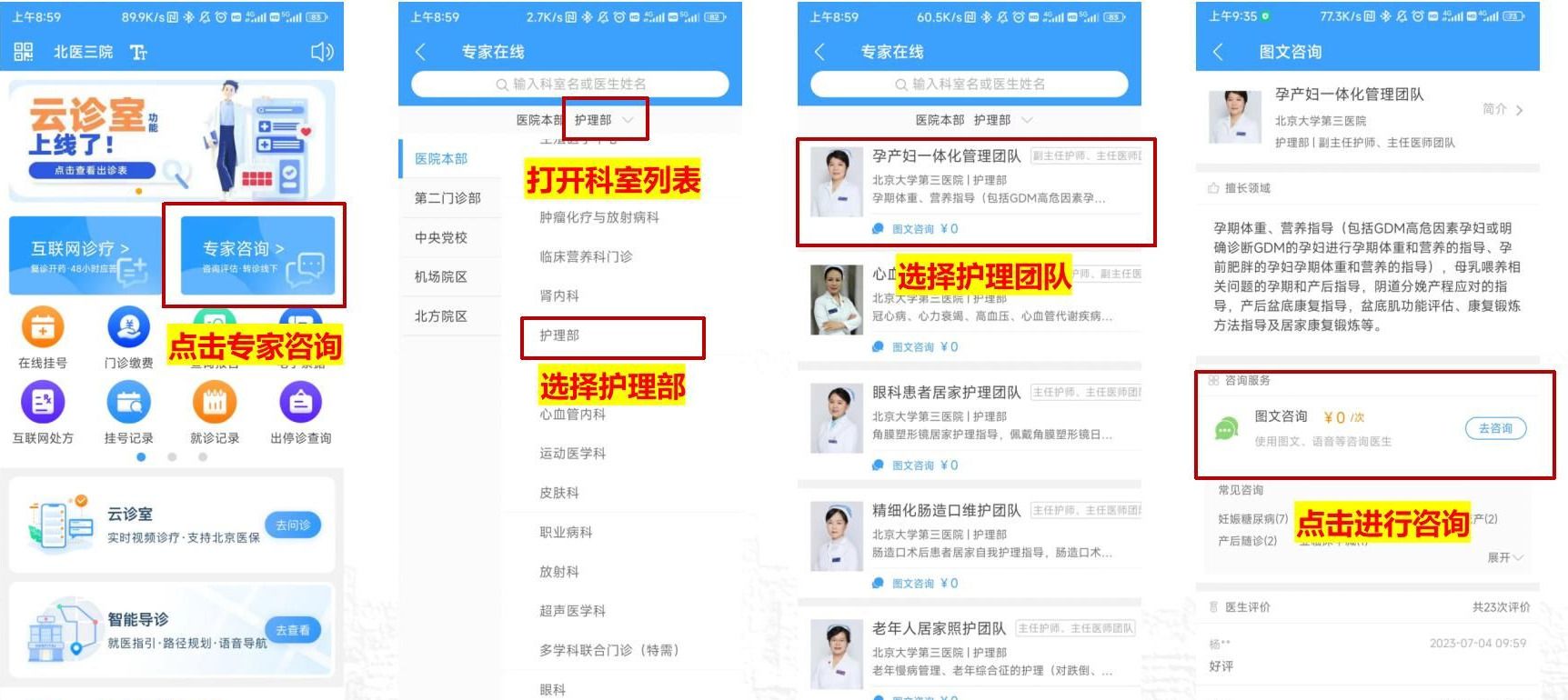 北医三院互联网医院已开通专科护理团队线上咨询,资深护理专家利用碎片化时间,为患者提供着专业的指导和服务。充分发挥专业技术优势,体现有温度的专业护理服务,让患者足不出户就能够享受到与院内同质化的专业护理服务,提升了患者的就医体验,增强了患者的健康获得感。您可登陆“北医三院”APP,点击“专家咨询”,在科室中选择“护理部”后选择相应的团队进行患者资料提交及流程咨询。