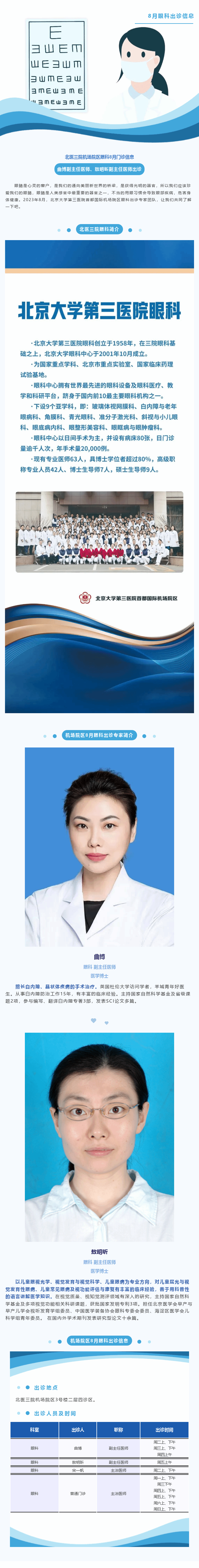 机场院区眼科8月门诊信息丨曲博副主任医师、敖明昕副主任医师带队出诊