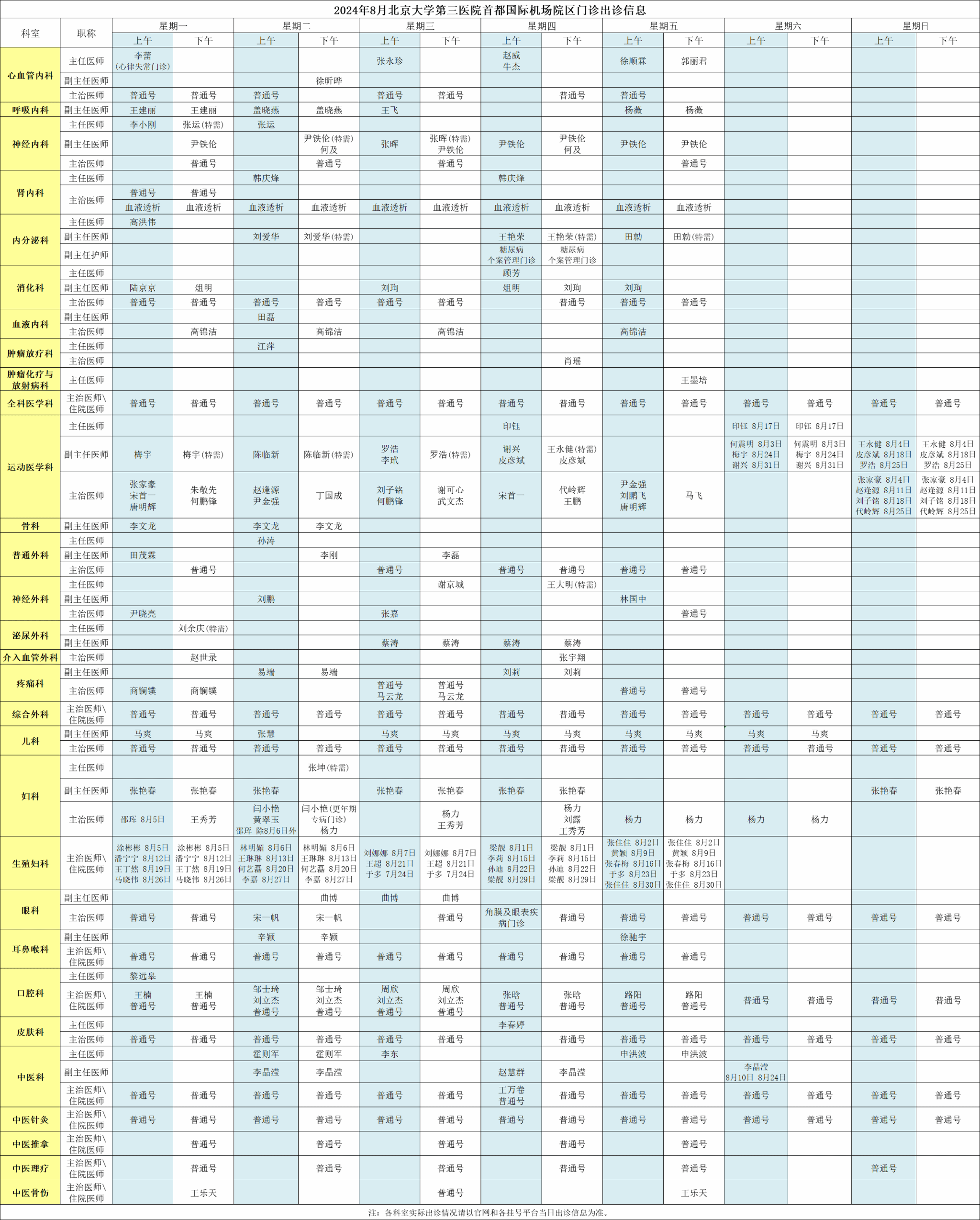 北医三院机场院区2024年8月门诊出诊信息