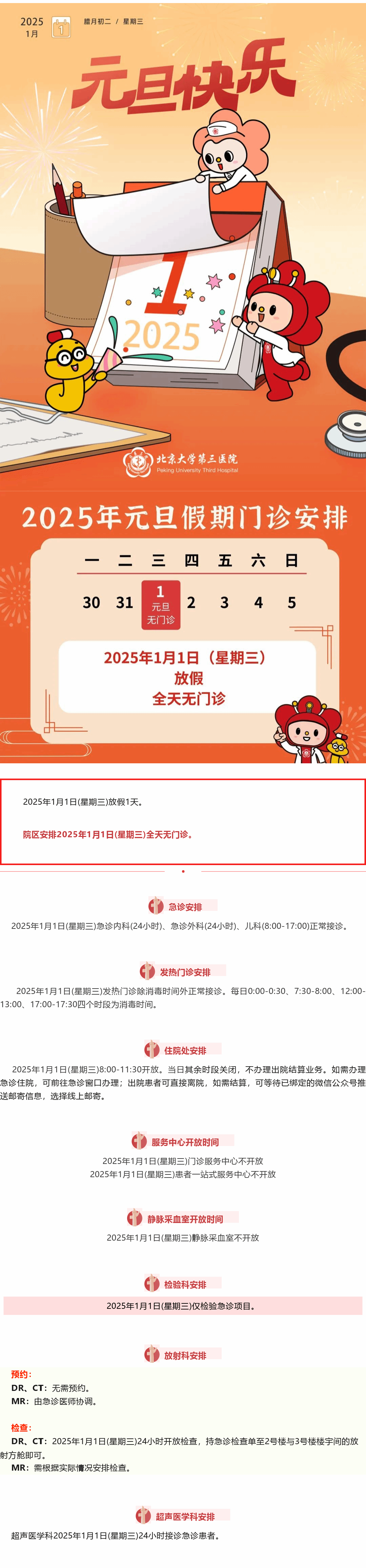 北医三院机场院区2025年元旦假期安排