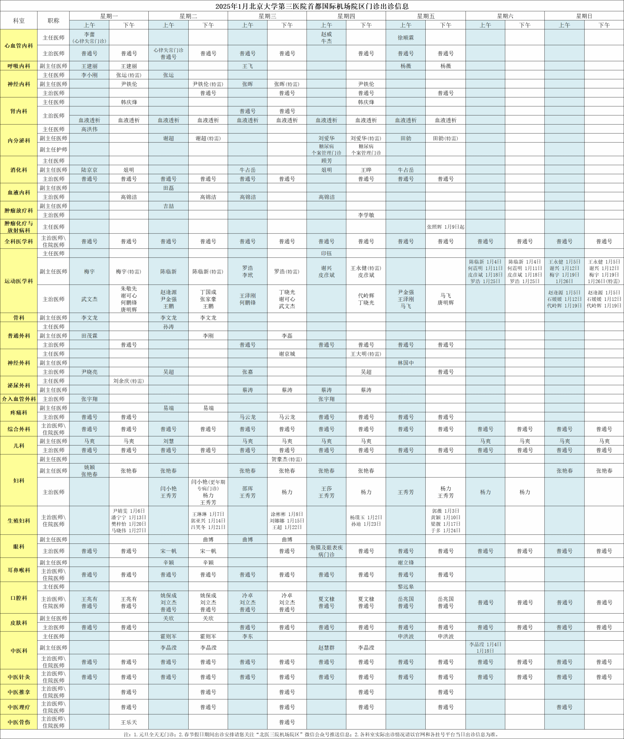 北医三院机场院区2025年1月门诊出诊信息