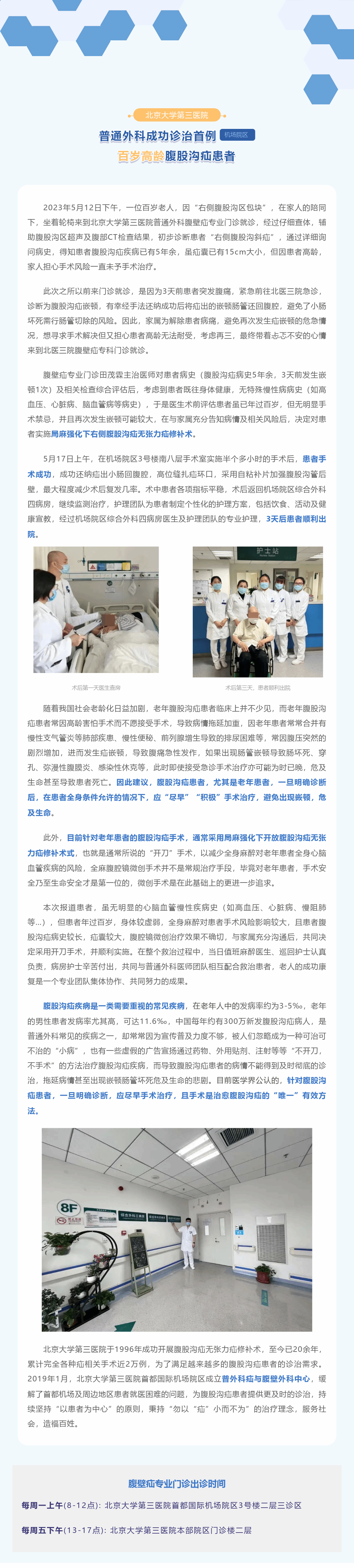 北医三院机场院区普通外科成功为全院首例百岁高龄腹股沟疝患者实施局麻强化下右侧腹股沟疝无张力疝修补术