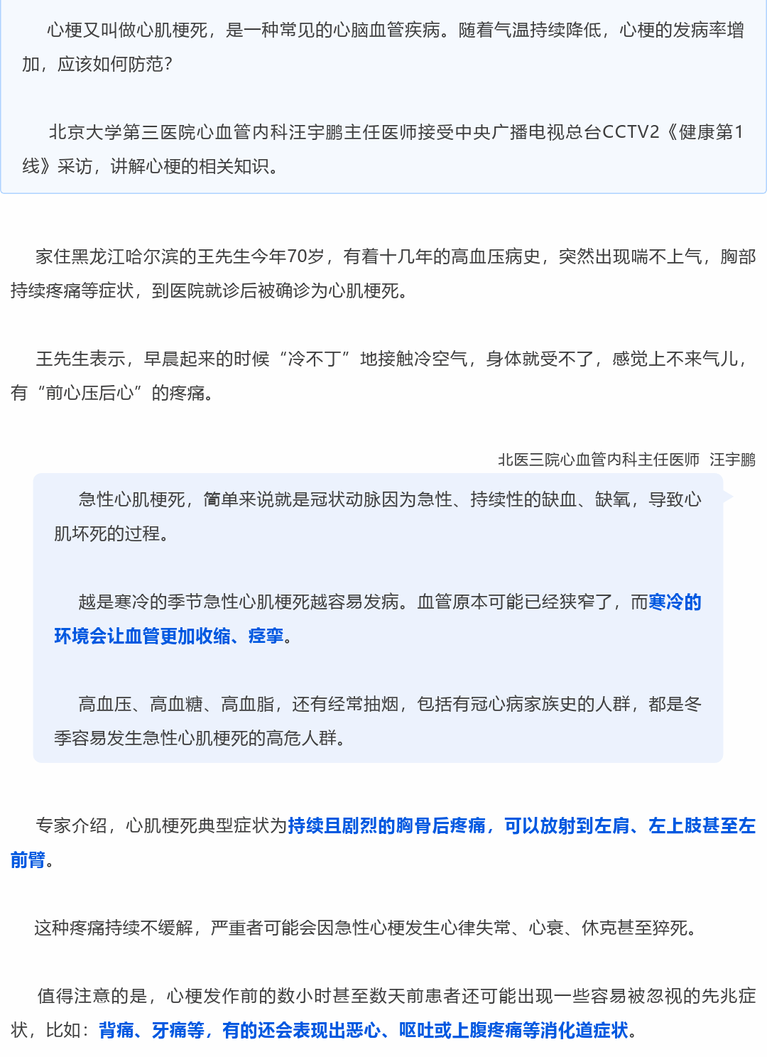 央视:冬季易发心梗,需警惕先兆症状