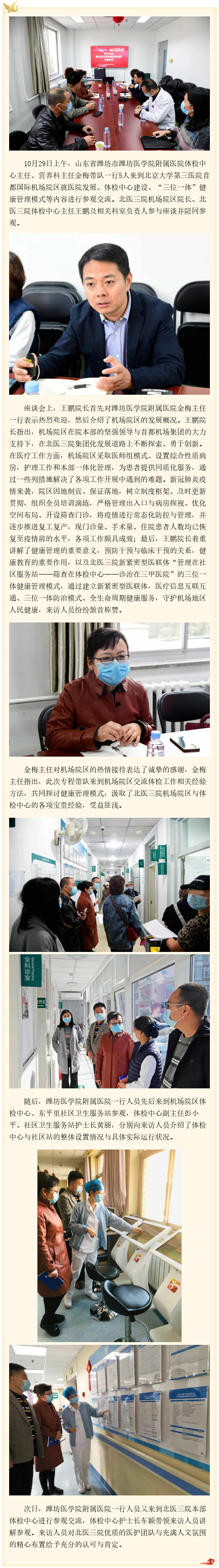7月17日上午,北京大学第三医院北方院区院长王青山、党委书记李文凯带队一行14人来到北医三院机场院区就医院管理、改革与融合、学科建设等内容进行参观交流。机场院区院长王鹏、执行院长曾赴云等院区领导以及相关科室...